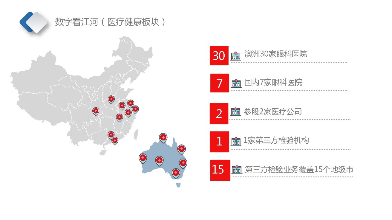 2018年,江河醫(yī)療健康板塊業(yè)務(wù)保持穩(wěn)步發(fā)展,營(yíng)業(yè)收入同比有所增長(zhǎng),同時(shí)通過資本運(yùn)作,加速向醫(yī)療健康業(yè)務(wù)轉(zhuǎn)型的步伐。在海外,澳洲Vision業(yè)務(wù)發(fā)展形勢(shì)較好,業(yè)績(jī)穩(wěn)中有進(jìn),在澳洲各地共擁有30家眼科醫(yī)院及手術(shù)中心;2018年同比例向Healius(Primary )配股增資;2019年1月,向Healius發(fā)出非約束力報(bào)價(jià)函,啟動(dòng)收購(gòu)工作,為做大第三方檢驗(yàn)業(yè)務(wù)、加速醫(yī)療轉(zhuǎn)型、實(shí)現(xiàn)雙主業(yè)平行發(fā)展而全力以赴。在國(guó)內(nèi),江河澤明眼科營(yíng)收增長(zhǎng)較快,2月還并購(gòu)了南通啟榮眼科醫(yī)院,至此,江河醫(yī)療健康板塊在國(guó)內(nèi)擁近10家眼科醫(yī)院;11月,江河集團(tuán)又收購(gòu)南京華晟醫(yī)學(xué)檢驗(yàn)實(shí)驗(yàn)室有限公司,江河醫(yī)療版圖不斷擴(kuò)大,在第三方檢驗(yàn)業(yè)務(wù)上也邁出了實(shí)質(zhì)性的一步。截止到2018年12月31日,江河醫(yī)療健康板塊國(guó)內(nèi)外投入凈資產(chǎn)約34億元。